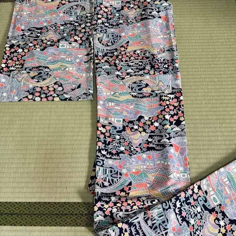 블랙 베이스에 다채로운 전통 일본풍 패턴이 베풀어진 코몬 기모노. - 디자인: 다채로운 색상의 전통 일본풍 패턴 - 소재: 불명 - 색상: 네이비 베이스에 다채로운 꽃무늬와 풍경 - 스타일: 코몬 기모노 - 기장: 160cm - 화장: 65cm 방문해 주셔서 감사합니다.