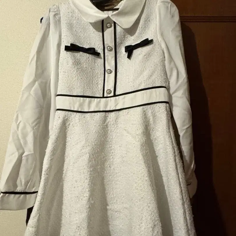 화이트 A라인 원피스, 리본 포함 포켓과 스팽글 버튼이 특징입니다. - 색상: 화이트 - 디자인: 긴팔, 카라 부착, 리본 포함 포켓 - 소재: 겉감: 폴리에스테르 100%, 안감: 폴리에스테르 100% - 장식: 스팽글 버튼, 블랙 라인 - 스타일: A라인 방문해 주셔서 감사합니다. 사이즈 - FREE SIZE