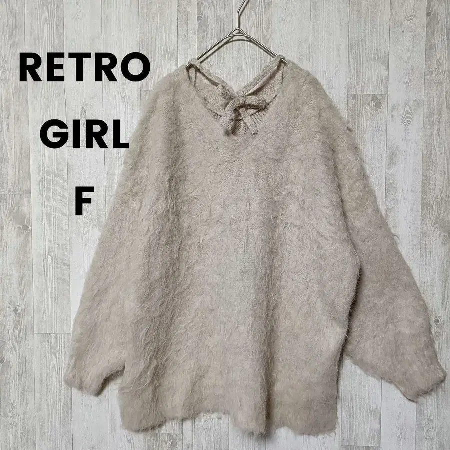 레트로걸 샤기 니트 스웨터 F 베이지 리본 V넥 복슬복슬