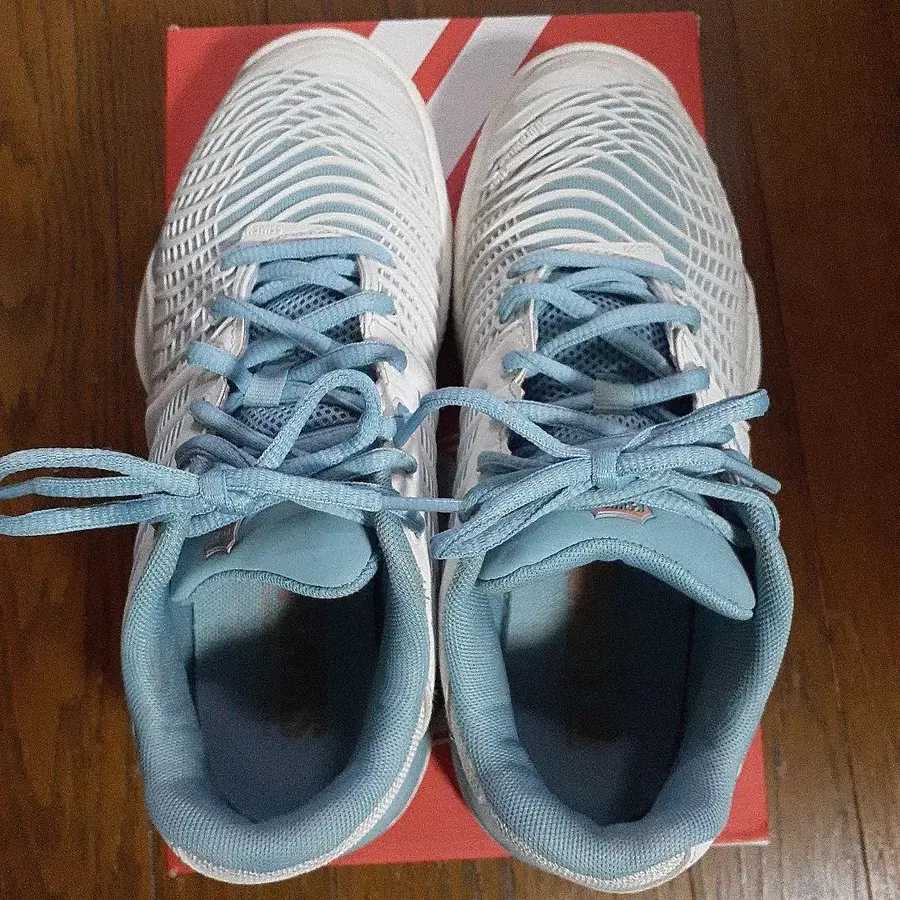 K-SWISS 메쉬 어퍼와 러버 솔 테니스화, 쾌적한 착용감. - 사이즈: 23.5cm - 색상: 화이트/블루 - 디자인: 메쉬 어퍼 - 밑창: 러버 솔 - 스타일: 테니스화 (올코트용) - 특징: 경량 설계 방문해 주셔서 감사합니다. 안쪽, 신발 밑바닥에 약간의 얼룩이 있지만, 여전히 충분히 신으실 수 있는 상품입니다.