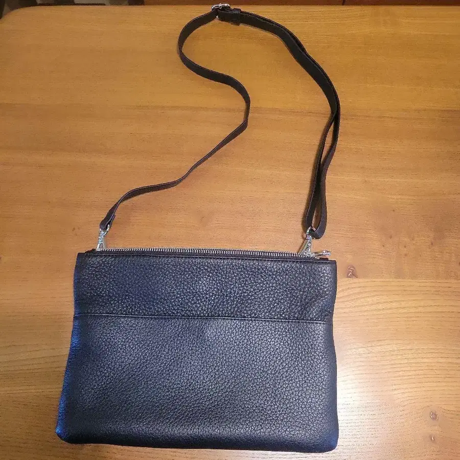 블랙 가죽 숄더백, 조정 가능한 스트랩 포함.
