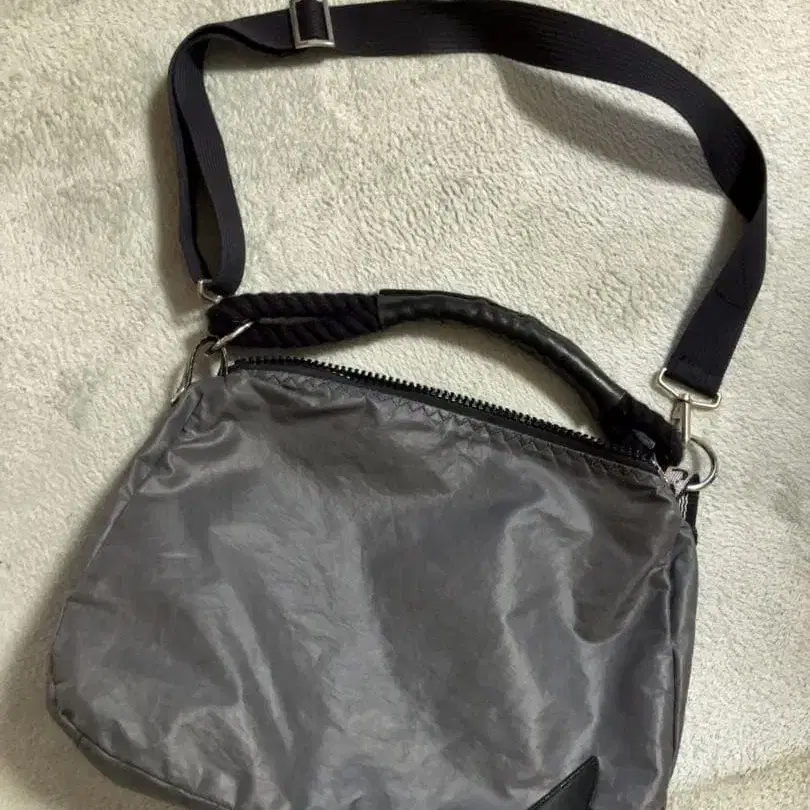 경량 나일론 소재의 그레이 숄더백, 블랙 삼각형 로고 포함.