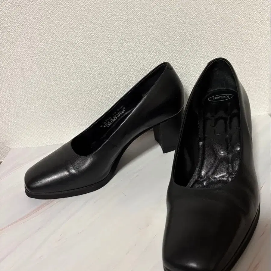락포트의 쿠션성이 있는 가죽 소재의 블랙 하이힐, 스퀘어토 디자인입니다.
