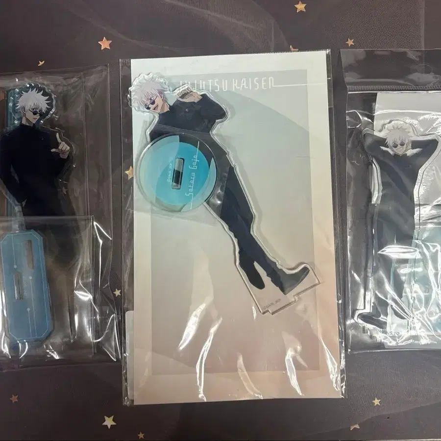 고죠 사토루 아크릴 스탠드 3개 세트입니다. 사진의 왼쪽 아크릴 스탠드만 개봉 완료했으며, 사진에는 보이지 않을 정도의 스크래치가 있습니다. 양해 부탁드립니다. 낱개 판매 불가