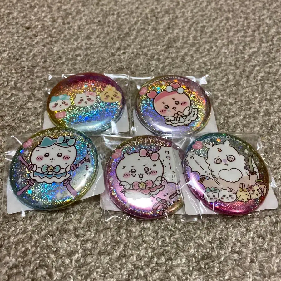 치이카와 (먼작귀) 초 매지컬 치이카와 홀로그램 캔뱃지 5개 모두 새상품 미개봉품입니다. [ 상품 상태 ] 새상품 미개봉 자택 보관으로 인해 외장에 아주 미세한 스크래치나 접힘이 있을 수 있습니다. 발송 시에는 묶어서 에어캡으로 포장하여 보내드립니다. 하치와레 카니짱 아노코 토끼 모몽가 밤만쥬 치이카와 (먼작귀)
