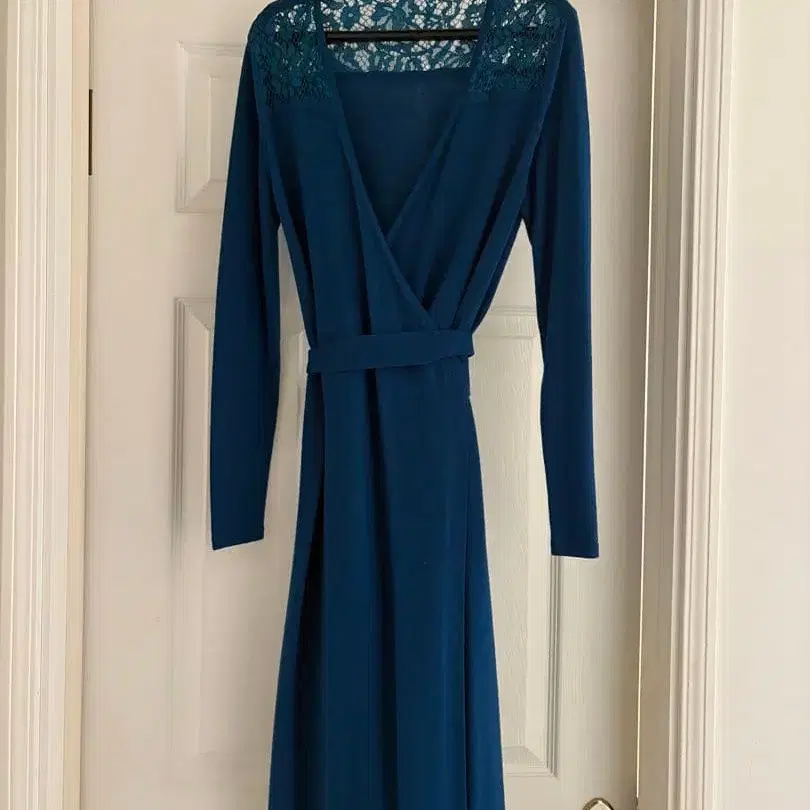 레이스 디테일 피콕 그린 긴팔 랩 드레스.