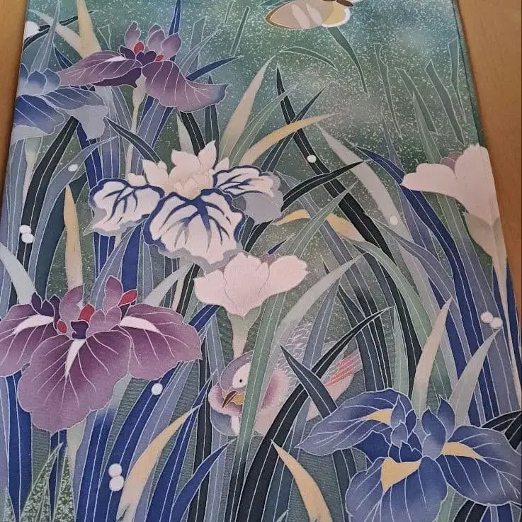 붓꽃과 물새 무늬가 아름다운 호몬기. 클리닝 완료되었습니다. 오동나무 서랍장에서 자택 보관했던 것입니다. 이해해 주실 수 있는 분, 잘 부탁드립니다. 방문해 주셔서 감사합니다.