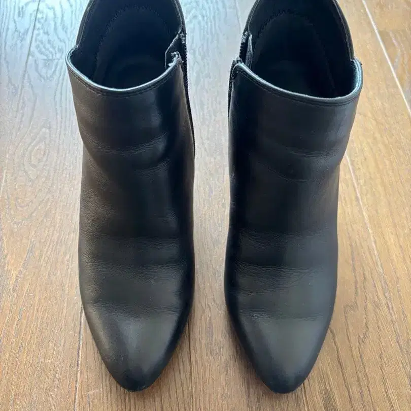 심플하고 스타일리시한 블랙 앵클부츠, 중간 힐 디자인.