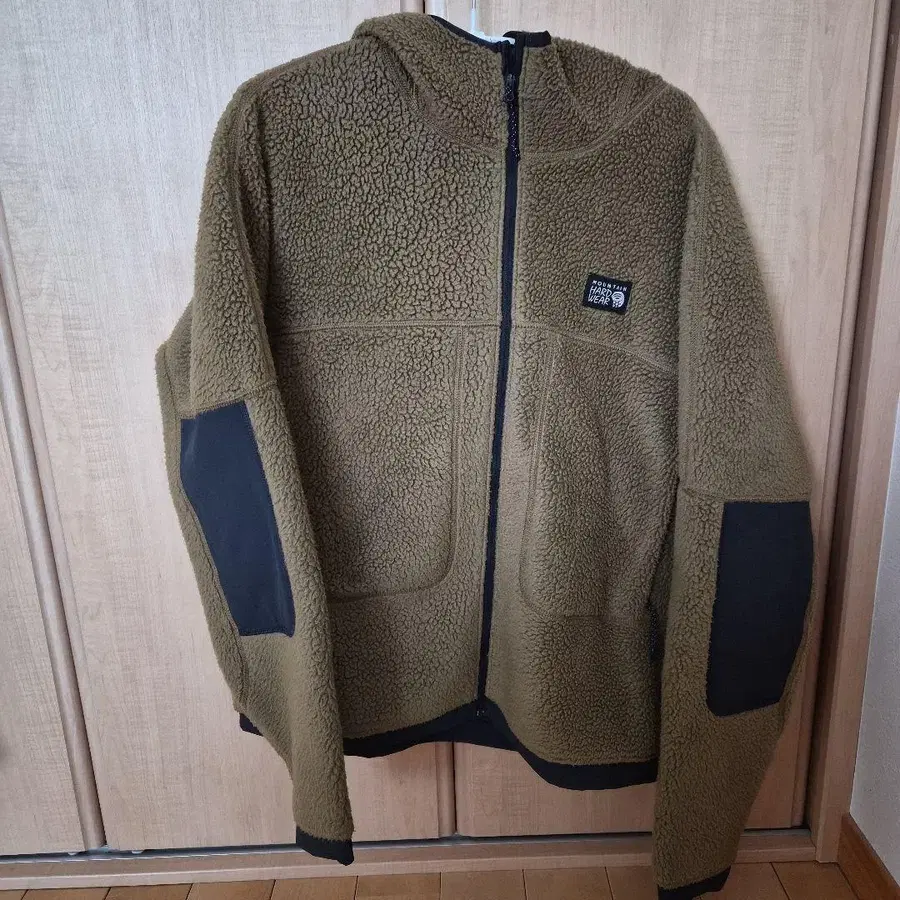 후드 부착 올리브 색상 플리스 자켓, 보아 소재로 따뜻하며, 앞면에 포켓 부착.