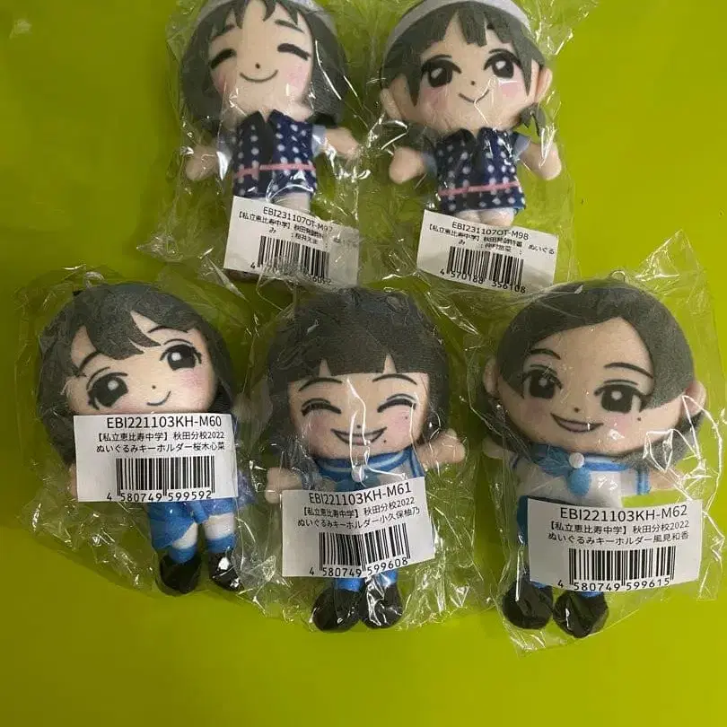 그룹명 - 사립 에비스 중학교 아이템 종류별 - 봉제 인형 사쿠라기 코코나 아키타 분교 2022 코쿠보 유노 아키타 분교 2022 카자미 와카 아키타 분교 2022 사쿠라이 에마 아키타 분교 2023 나카무라 유나 아키타 분교 2023 봉제 인형 5개 세트 판매입니다. 낱개 판매 불가합니다. 공식 통신 판매로 구매하여 보관했습니다.
