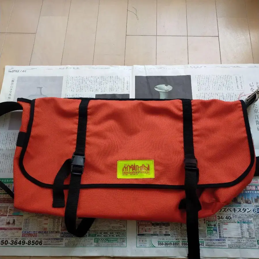 내구성 있는 캔버스 원단의 오렌지 메신저 백, 조정 가능한 숄더 스트랩 포함.