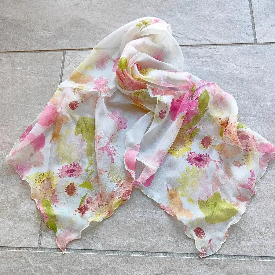 엠엠 디자인 스튜디오의 일본제 워셔블 꽃무늬 스카프입니다. 수채화로 그려진 싱그러운 꽃들이 귀엽습니다. 핑크와 그린의 부드러운 색감이 매력적입니다. 실크 100%로 촉감이 매우 좋습니다. 약 125cm x 34cm입니다. 꽃잎처럼 살랑거리는 마름모 형태의 사이드 디자인이 화려합니다.