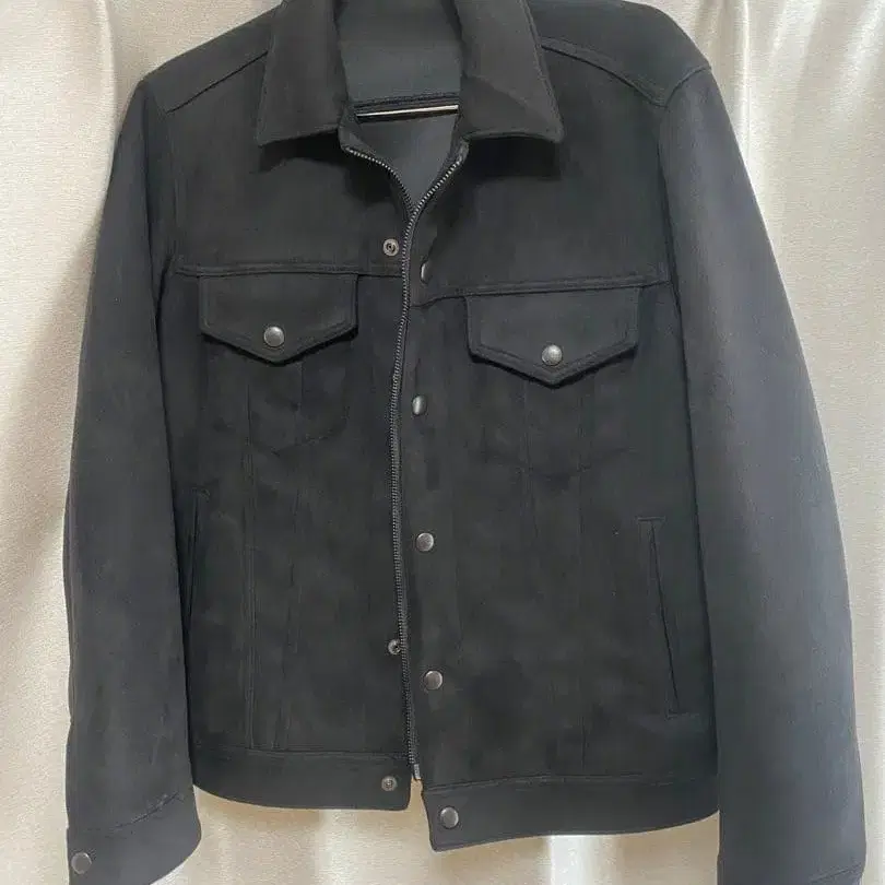 블랙 페이크 스웨이드 캐주얼 자켓, 버튼과 지퍼 프론트 개폐 포함.