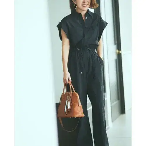 허리 조절 가능한 블랙 반팔 올인원, 경량 소재로 쾌적.