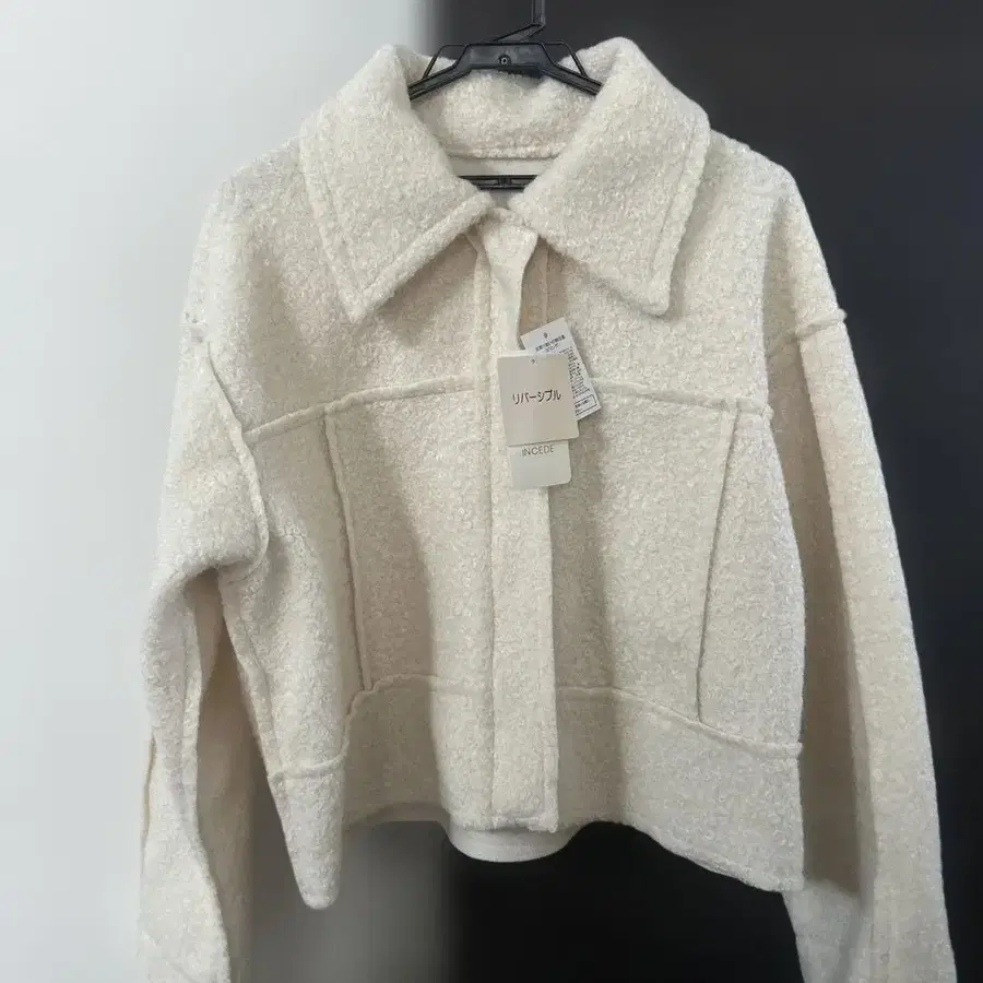 부드러운 폴리에스테르 소재의 카라 부착 크롭 자켓.