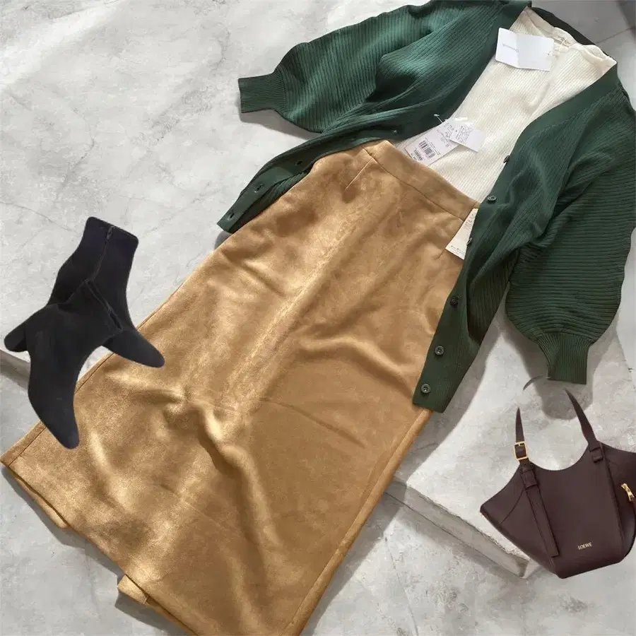 그린 색상의 가디건에 스웨이드 느낌의 롱 스커트를 매치했습니다.
