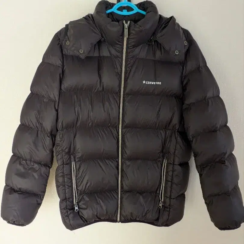 자동 번역되었어요. 원문보기후드 부착 블랙 다운 자켓, CONVERSE 별 마크 로고 부착.