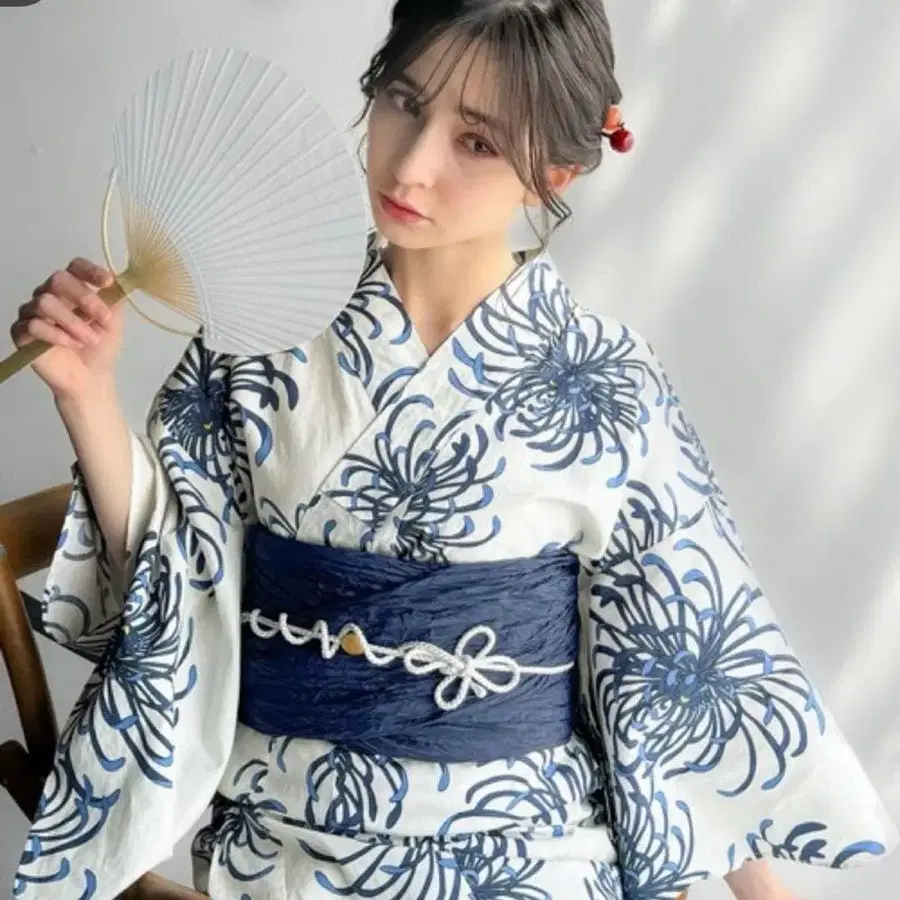 화이트 베이스에 파란색 국화꽃무늬가 있는 여성용 유카타와 다크 네이비 색상의 오비 세트입니다.