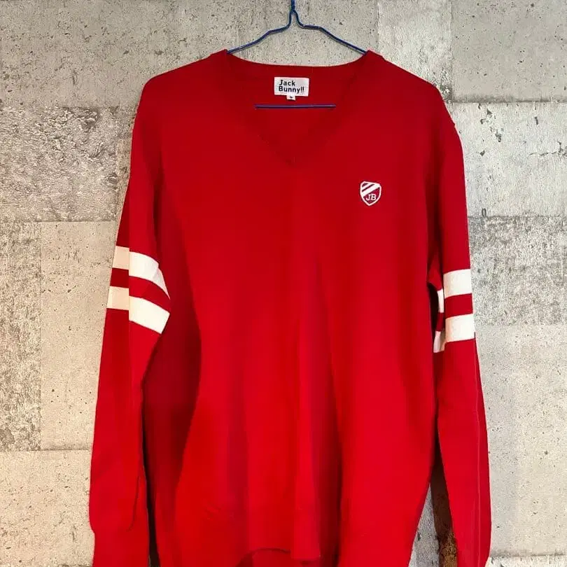 자동 번역되었어요. 원문보기빨간색 V넥 스웨터, 스트라이프 디자인, Jack Bunny!! 로고 자수 포함.