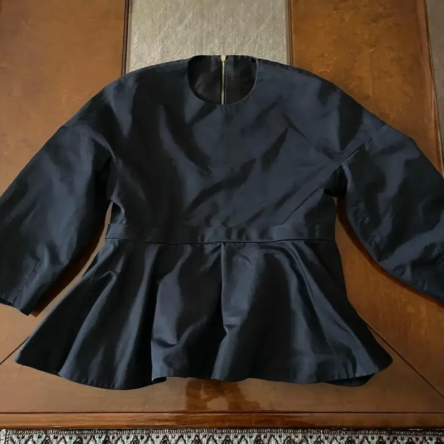다크 블루 페플럼 스타일로, 뒷면 지퍼가 달린 7부 소매 블라우스