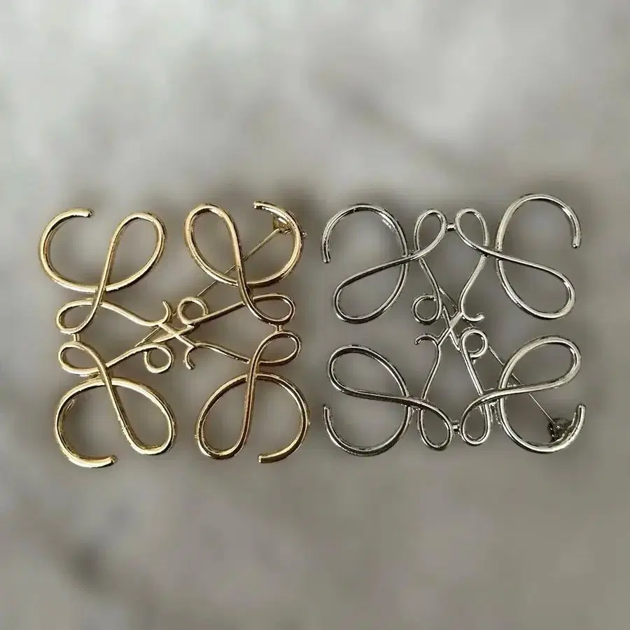 아나그램 모티브의 골드와 실버 브로치. 2개 세트입니다. - 색상: 골드, 실버 - 디자인: 아나그램 모티브 - 사이즈: 약 5cm x 5cm