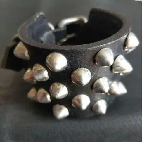 본인 핸드메이드로 9mm 미니 콘 스터드를 사용한 본 가죽제 리스트 밴드입니다. 폭 4.5cm. 이미지의 것은 판매자 제작 개인물품(샘플)이므로, 구매를 희망하시는 분은 댓글로 손목 둘레 길이를 알려주세요.