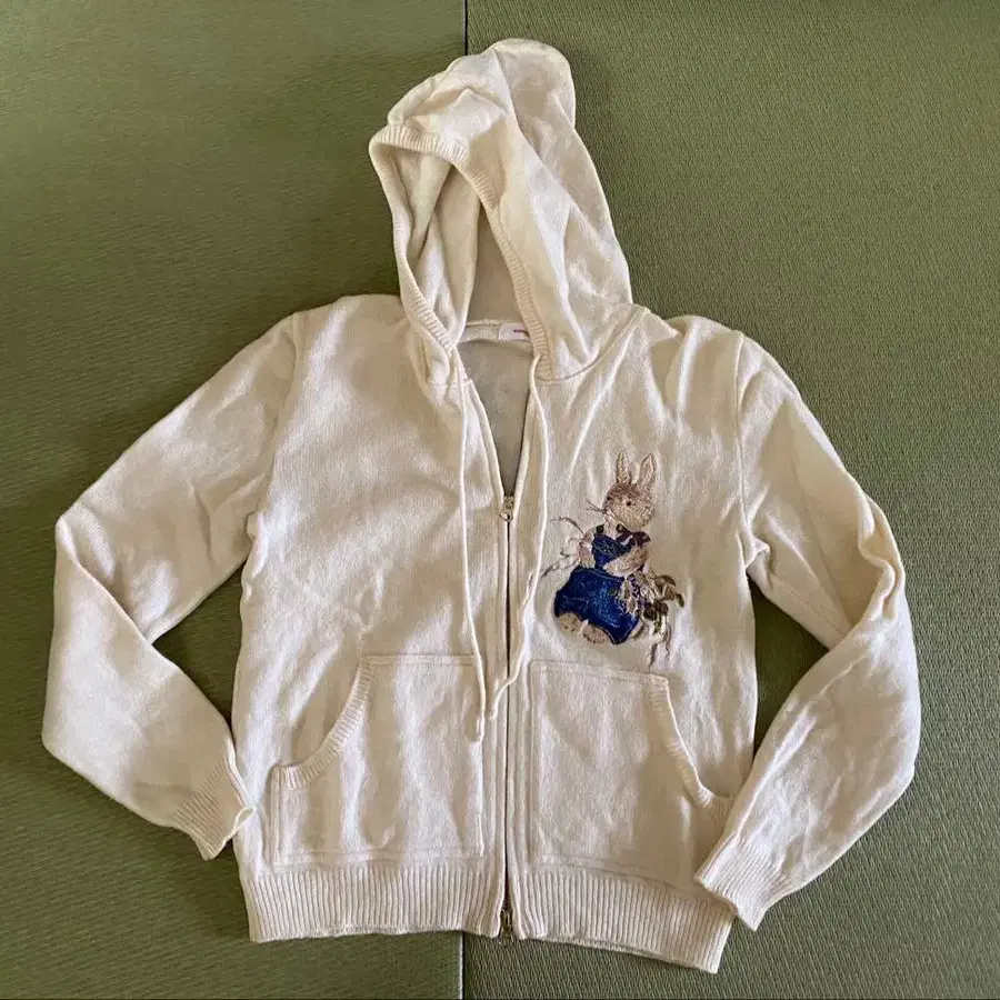 베이지 색상에 토끼 자수가 있는 니트 후드티입니다. 정확히 기억나지는 않지만 약 10년 전에 선물 받은 것으로 3~4회 착용 후 손세탁하여 보관했습니다. 약간의 보풀과 접힘 주름이 있습니다. 기장 약 54cm 가슴 너비 약 46cm 소매 길이 약 59cm 모 80% 나일론 20% 자택 보관이므로 이해하신 후 구매 부탁드립니다. #원더풀월드