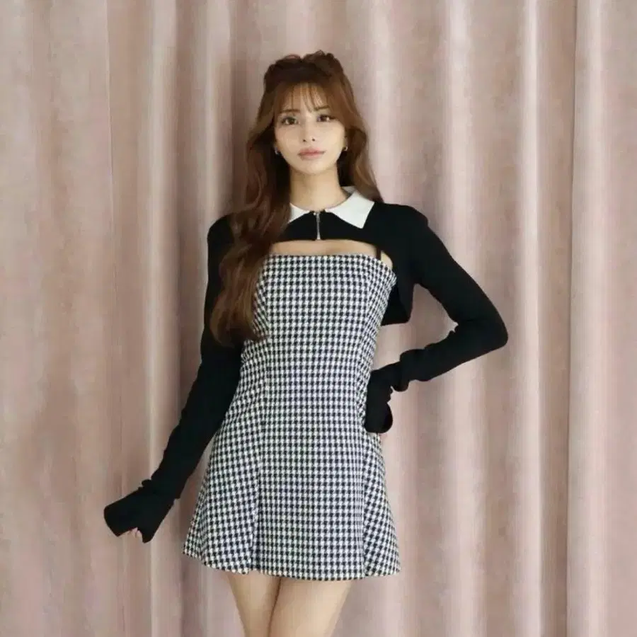 립 서비스 체크 자카드 앙상블 니트 원피스 블랙