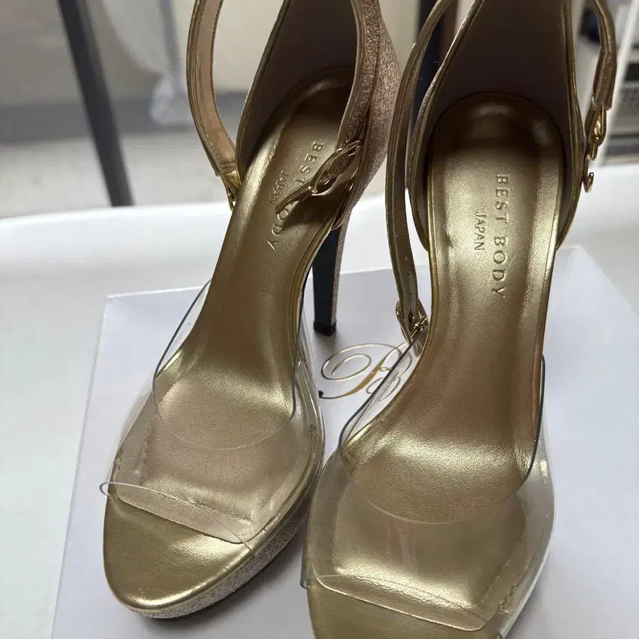 자동 번역되었어요. 원문보기글리터 마감 골드 하이힐, 클리어 스트랩 포함, 사이즈 23cm.