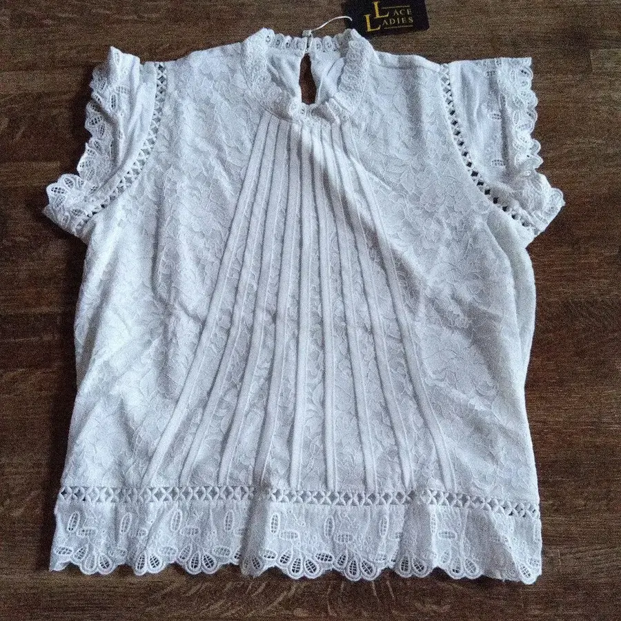 레이스 소재의 화이트 슬리브리스 셔츠, 플리츠 디자인과 프릴 소매가 특징. - 색상: 화이트 - 디자인: 레이스 소재, 플리츠 - 소매 스타일: 프릴 소매 - 장식: 밑단 레이스 트리밍 - 백 스타일: 버튼이 있는 입구 방문해 주셔서 감사합니다.
