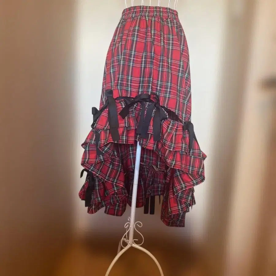 빨간색과 블랙 체크 무늬의 플레어 스커트, 리본이 달린 프릴이 특징입니다. - 색상: 빨간색과 블랙 체크 - 디자인: 플레어 스커트 - 소재: 불명이나 가벼운 원단 - 장식: 리본 포함 프릴 방문해 주셔서 감사합니다. 사이즈 - FREE SIZE