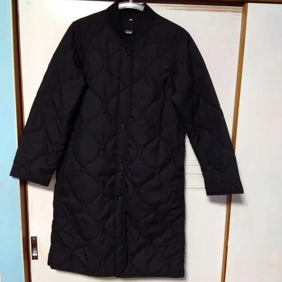 퀼팅 디자인의 블랙 롱 코트입니다. 폴리에스테르 100%로 가볍습니다.