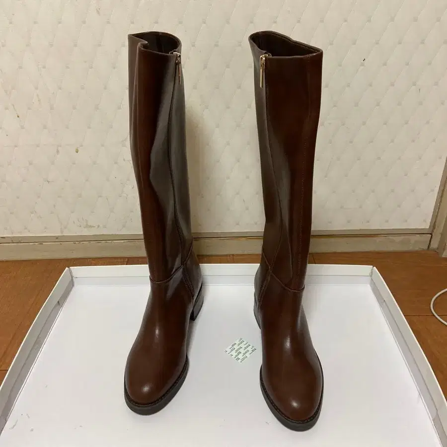 EVOL의 롱 부츠입니다. 브라운 색상이며, 사이즈는 23.5cm입니다. 구매 시 한 번 신어본 새상품입니다. 작은 키이신 분들도 신으실 수 있습니다.