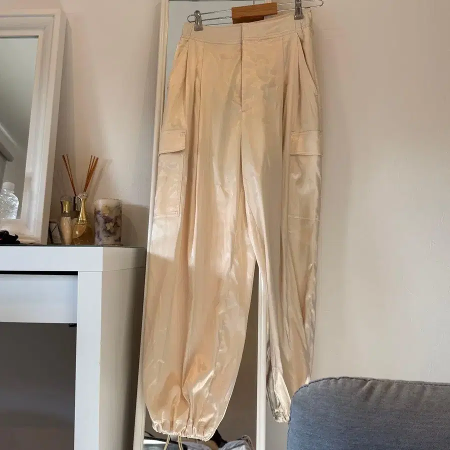 새틴풍의 크림색 카고 팬츠, 포켓 2개 부착. - 브랜드: STYLEMIXER - 색상: 크림 - 스타일: 카고 팬츠 - 소재: 새틴풍 - 포켓 수: 2 방문해 주셔서 감사합니다. 프로필 확인 후 구매 부탁드립니다. m(_ _)m