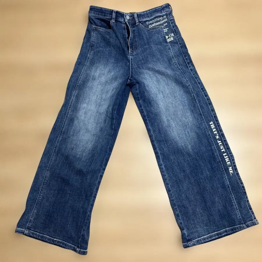 다크 블루 부츠컷 데님, 커스터마이즈 가능하며, 사이드에 텍스트 프린트 있음. - 색상: 다크 블루 - 스타일: 부츠컷 - 커스터마이즈: 커스터마이즈 가능 - 프린트: 텍스트 프린트 있음 방문해 주셔서 감사합니다.