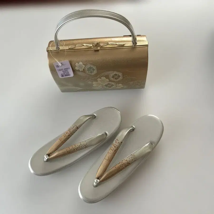 골드 컬러 꽃 무늬가 장식된 일본 의류용 백과 은색 조리의 세트. 프리 사이즈 - 백 색상: 골드 컬러 - 백 디자인: 꽃 무늬 - 조리 색상: 은색 - 조리 디자인: 무늬가 들어간 하나오 방문해 주셔서 감사합니다.