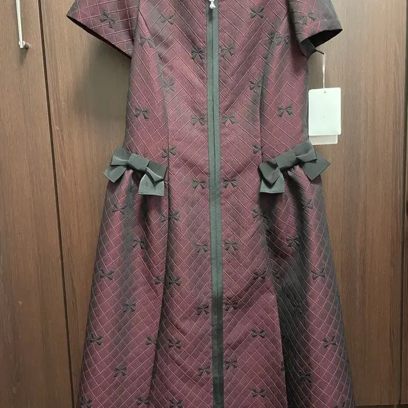 미사용 새상품 엠즈 그레이시 리본 무늬 자카드 원피스 사이즈 40 2025년 AW 정가 55,000엔 - 색상: 버건디 - 디자인: 리본 장식 - 스타일: 집업 - 소매 길이: 반팔