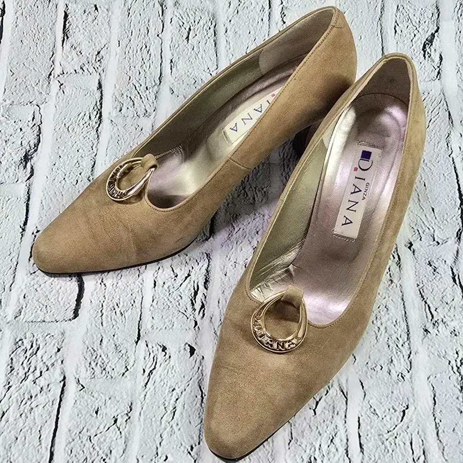 자동 번역되었어요. 원문보기베이지 스웨이드풍 스틸레토 펌프스, 링 장식 포함, 약 7cm 힐.
