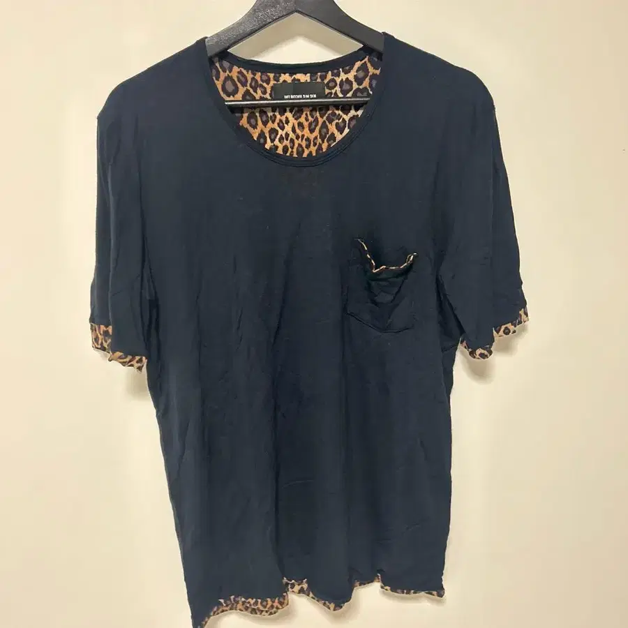 레오파드 무늬 디테일이 특징인 블랙 T셔츠.