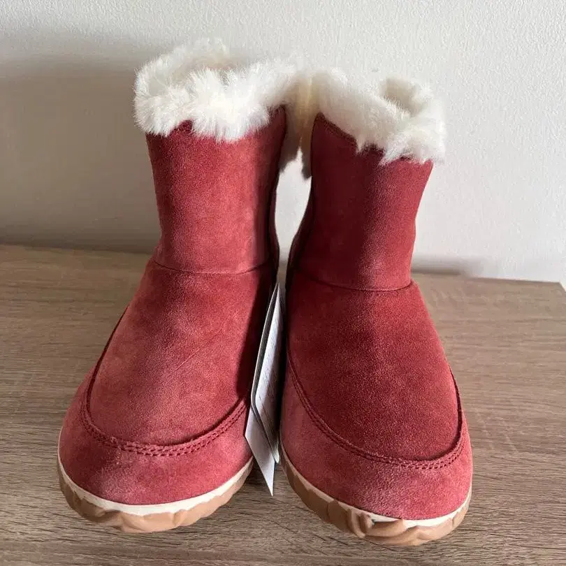 스웨이드 소재의 퍼가 달린 숏부츠, 러버 솔로 미끄럼 방지 디자인. - 브랜드: SOREL - 소재: 스웨이드 - 내부: 퍼 - 스타일: 숏부츠 - 밑창: 러버 솔 방문해 주셔서 감사합니다. 색상 - 핑크 계열 사이즈 - 26cm