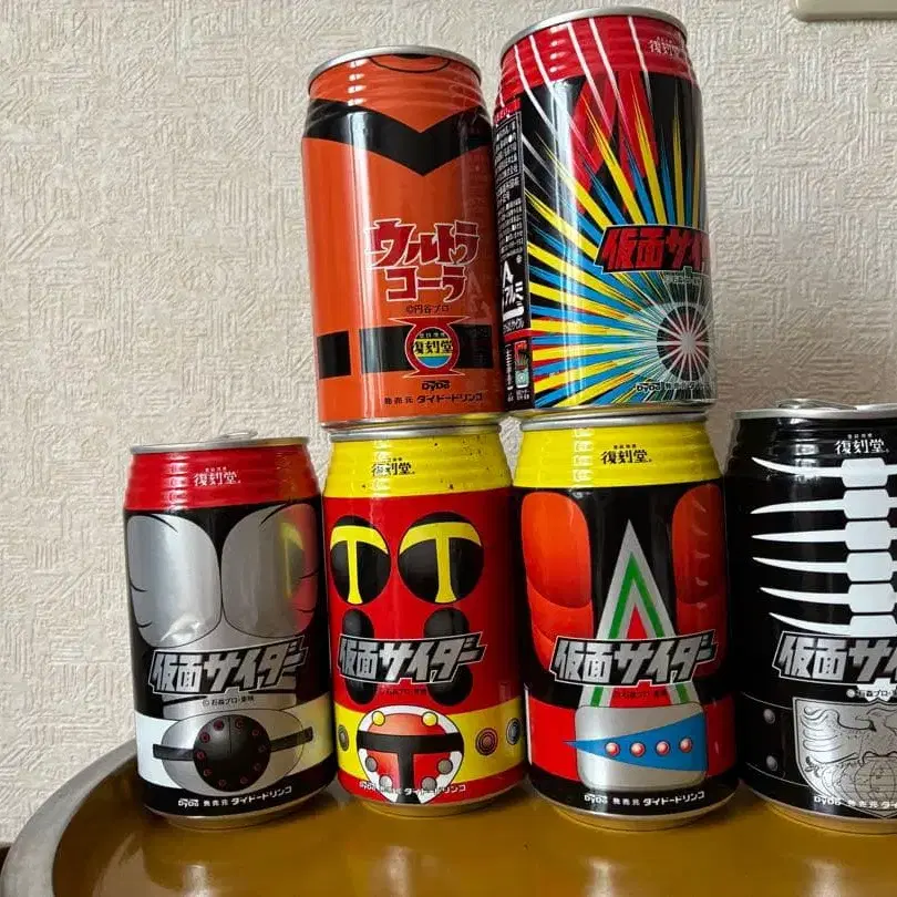 특촬물 캐릭터 디자인이 적용된 음료수 캔 6개 세트. - 종류: 음료수 캔 - 디자인: 특촬물 캐릭터 - 수량: 6개 세트 - 캐릭터: 가면라이더 - 색상: 빨간색, 블랙, 옐로우 컬러, 오렌지 - 제조국: 일본