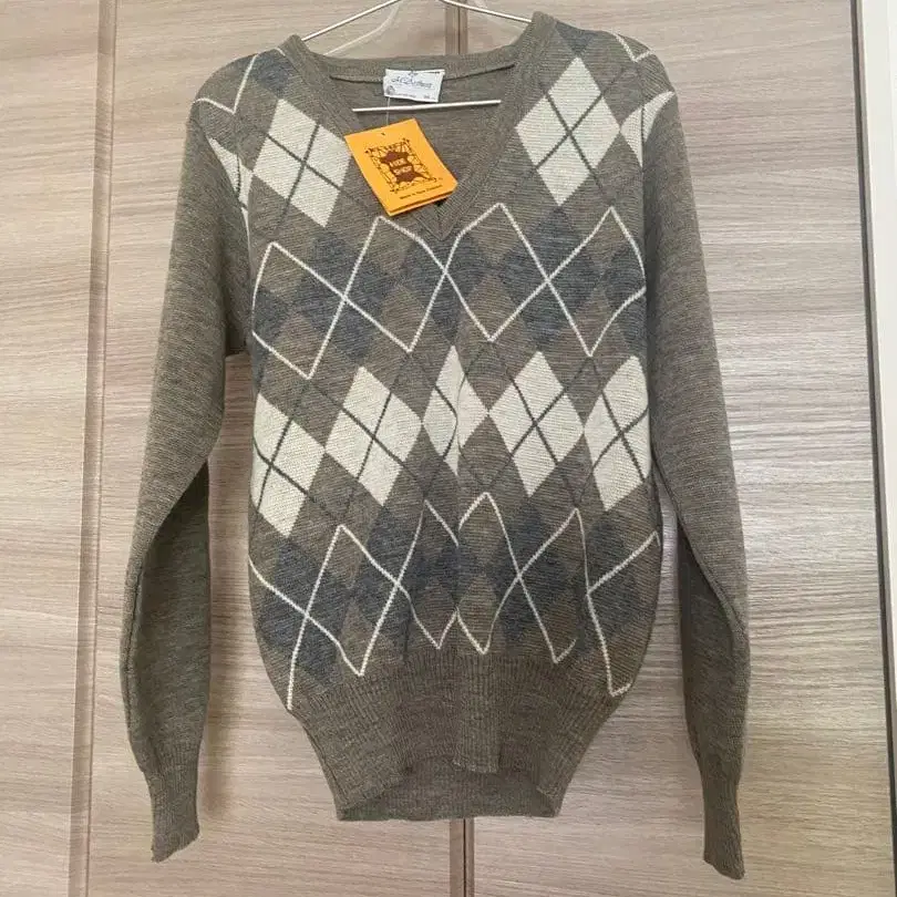 아가일 무늬의 그레이 계열 V넥 스웨터, 긴팔 디자인으로 스타일리시합니다.