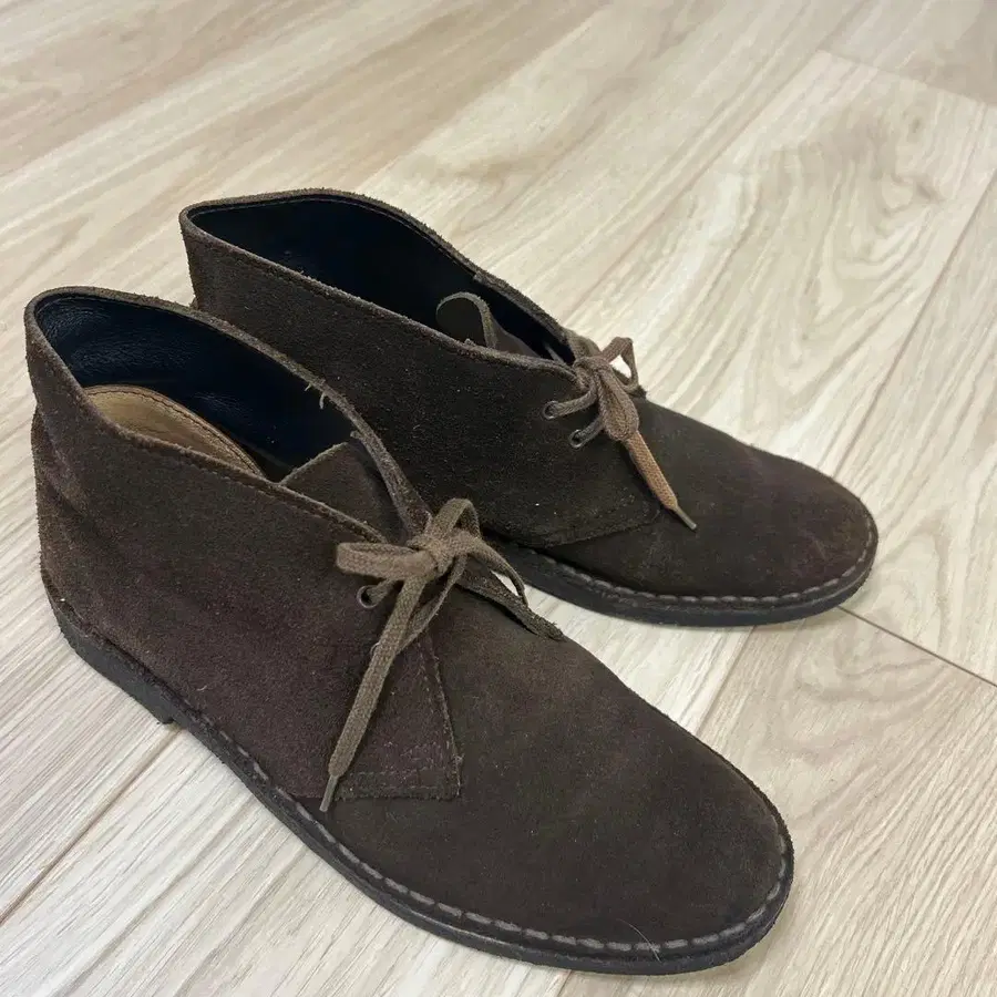 클락스의 데저트 부츠입니다. 흠집 등은 없으며, 밑창 마모도 거의 없습니다. 약간의 노후화로 인해 밑창이 딱딱하게 느껴질 수 있으나, 사용에는 문제가 없습니다. 진한 갈색 크레이프솔 사이즈 5하프, 23.5cm