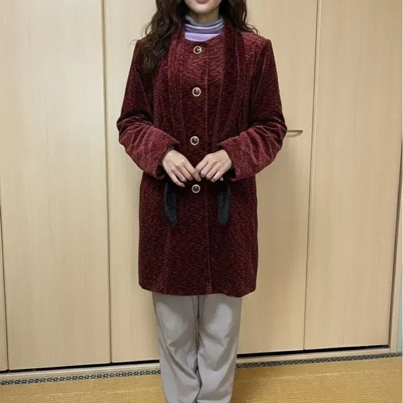 부드러운 플리스 소재의 와인 레드 자켓, 버튼과 태슬이 달려 있어 캐주얼에 최적입니다.