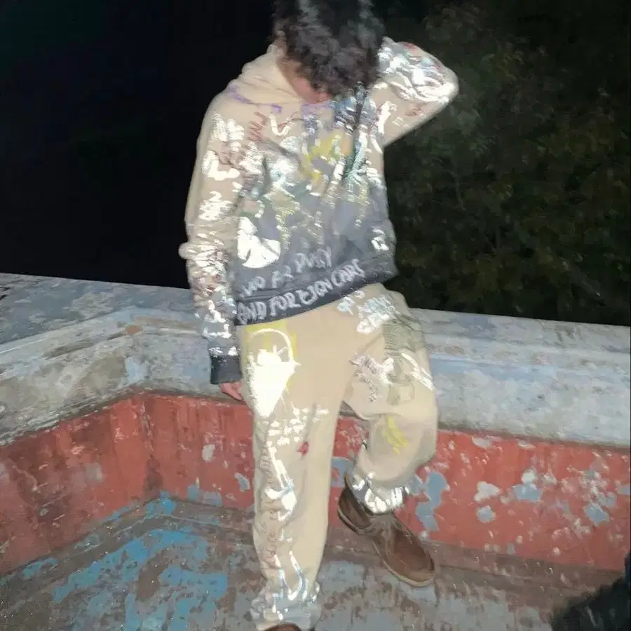 후드티에는 눈에 띄는 얼룩이나 손상은 없습니다. 하지만 바지에는 얼룩이 약간 있습니다.