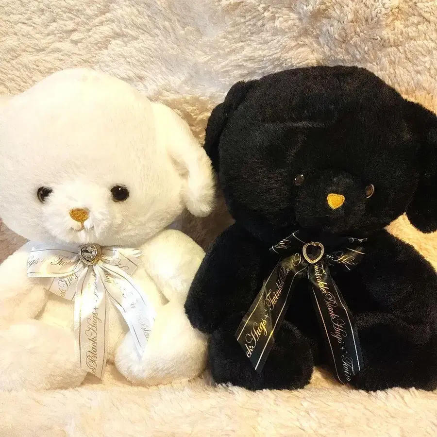 화이트와 블랙의 귀여운 봉제 인형, 하트 모양 참이 달린 리본으로 특별함을 더했습니다.