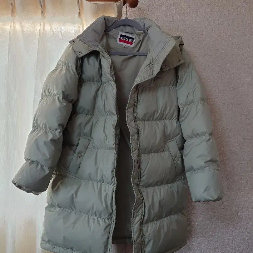 경량으로 따뜻한 Levis 라이트 그린 다운 자켓, M 사이즈입니다.