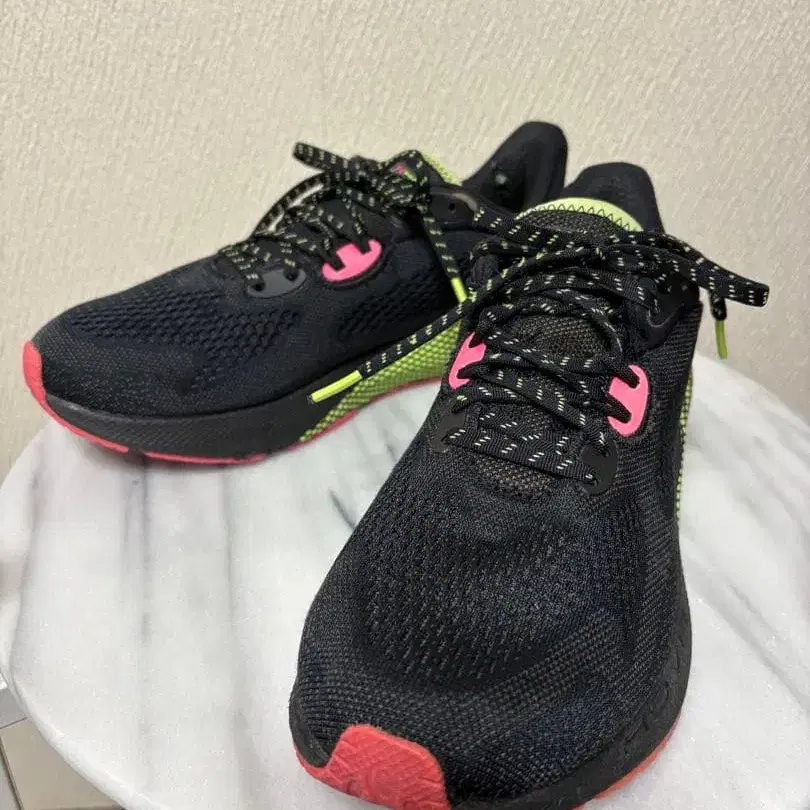 메쉬 어퍼와 쿠션성 있는 밑창을 갖춘 Under Armour 러닝화. - 브랜드: Under Armour - 색상: 블랙/그린/핑크 - 디자인: 메쉬 어퍼 - 밑창: 쿠션성 있는 밑창 - 끈: 스트레치성 있는 끈 방문해 주셔서 감사합니다.