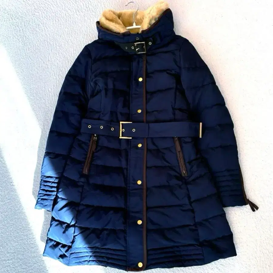 ZARA 자라 베이직 다운 자켓 다운 코트 스탠드 카라 후드 수납 벨트 탈부착 가능 가죽 금장 장식 골드 버튼 골드 네이비 紺 가죽 테이프 A라인