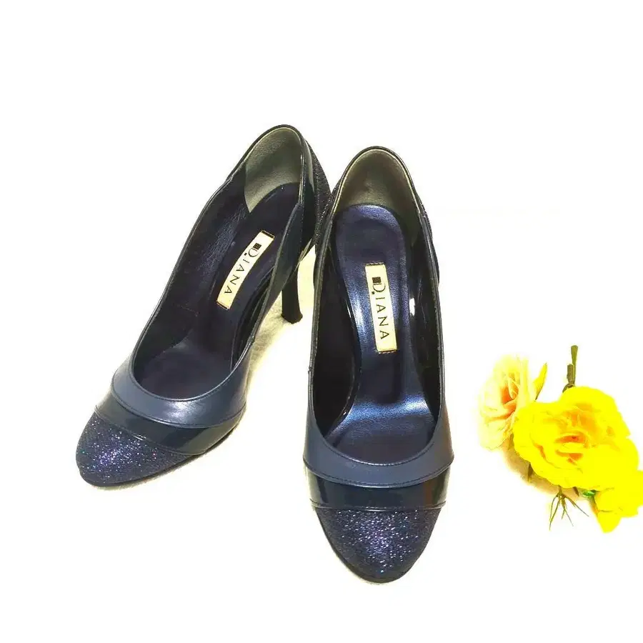 DIANA 펌프스입니다. 네이비 본체에 글리터 라메와 에나멜 절개 디자인이 특징입니다. 힐 부분도 동일 컬러로 통일되어 고급스러운 인상을 줍니다.